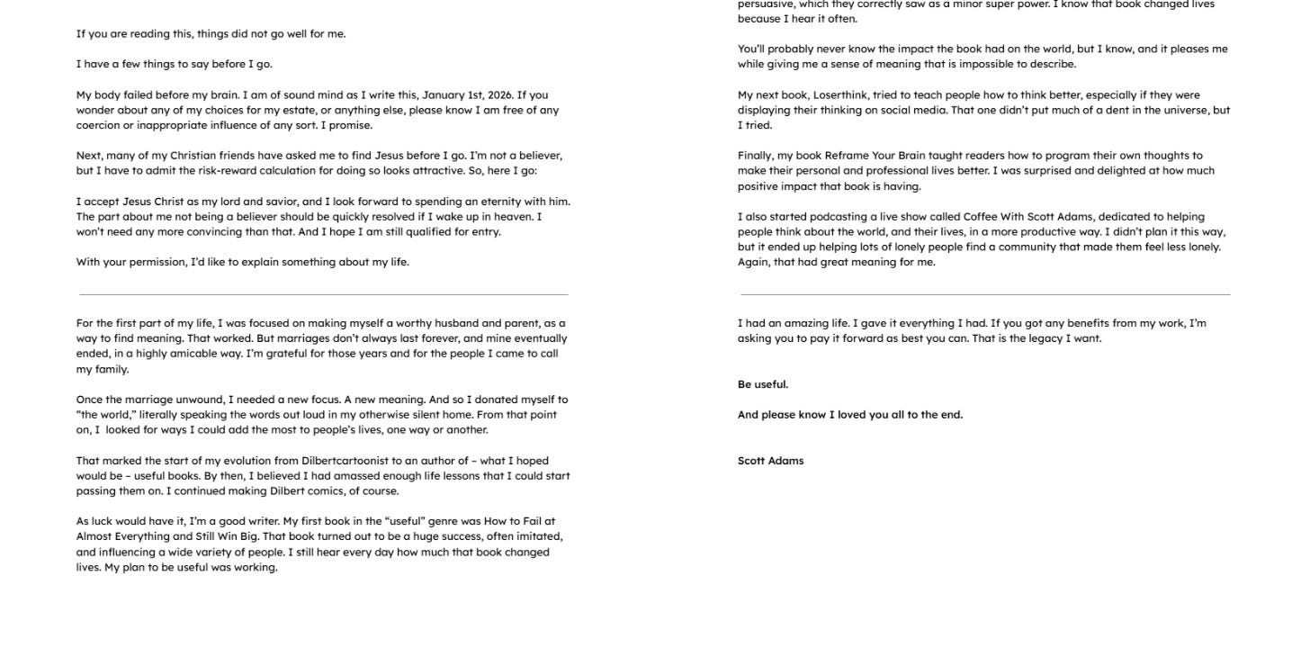 Scott Adams, seen in a familiar midlife frame, a half-smile, a gaze that suggested he was already turning your sentence into a punchline, died on January 13, 2026, at 68, after a battle with metastatic prostate cancer. His former wife, Shelly Miles, announced his death in a live-streamed statement, and in a gesture that was unmistakably Adams, she did not offer a press release or a managed narrative. She read his own words. He had spent his public life insisting that communication matters more than choreography, that clarity matters more than approval, and that the most durable legacy is usefulness. His parting message, which follows later in this obituary, ends with a request that is as simple as it is demanding: be useful. To read an obituary for a cartoonist is, in one sense, to do something small, to note the dates, to note the work, to offer a brief gratitude, and to move on. But Scott Adams was never simply a cartoonist, and Dilbert was never simply a comic strip. He was a cultural engineer who found the hidden structure of a modern life, the life of smart people trapped inside systems designed by committees, and he translated that structure into a daily language of shared recognition. He also became, later, a polarizing public figure, a man who turned his attentions from corporate nonsense to national politics, media, persuasion, and the civil religion of free speech. Some readers embraced him, some left him, many argued about him, but few who paid attention doubted his influence. If a life can be measured by the number of people who feel less alone because of your work, Adams’s life measures large. He was born Scott Raymond Adams on June 8, 1957, in Windham, New York, a small Catskills town where winter is long and modesty is not optional. His father was a postal clerk, his mother a real estate agent who later worked on a factory assembly line. The family’s circumstances were ordinary in the best American sense, not glamorous, not tragic, just the sturdy middle ground in which ambition must be self-generated. Adams was bright, and he was funny early, and he learned the crucial lesson that humor is not only entertainment, it is a tool for survival and a tool for truth. In high school he became valedictorian, and later he joked about it the way he joked about everything, deflating the pomp by noting how small the class was, as if to say, yes, I did well, but let’s not pretend it was destiny. He studied economics at Hartwick College in Oneonta, New York, graduating in 1979. He later pursued an MBA at the University of California, Berkeley, completing it in 1986, and in that arc you can already see the Adams pattern: a pragmatic mind, an appetite for systems, and a willingness to work hard at the unglamorous thing so that the glamorous thing might someday become possible. The story he told again and again was that he loved cartoons as a kid, but he did not begin as an artist in the romantic sense. He began as an American employee. His early jobs are not footnotes, they are the seedbed. After college he worked as a bank teller at Crocker National Bank in San Francisco, and he was robbed at gunpoint, twice. It is hard to imagine a more compressed tutorial in human incentives. You can read about crime in a paper, but there is a different knowledge that comes from seeing a person’s hand on a weapon and realizing that institutions are often thinner than we like to believe. In later years, when Adams wrote about persuasion, fear, and risk, you could hear the voice of someone who had learned those categories not only as abstractions. He then joined Pacific Bell, known as PacBell, where he worked as a technologist and later a financial analyst. The culture of corporate bureaucracy became his daily atmosphere. Meetings were not primarily for decisions, they were for signaling. Performance was not primarily for outcomes, it was for optics. Adams would later describe that a large portion of his job involved trying to look busy. It was a sentence that landed because it was true, and it was true in more offices than any one person had the courage to admit. In that environment, Dilbert was born, not as a grand plan but as a survival tactic. In the late 1980s, Adams began doodling during meetings and on his cubicle whiteboard. The nameless office worker with the curlicue tie and the potato-shaped head was a visual joke at first, but the deeper joke was structural. Dilbert did not exist to ridicule work. Dilbert existed to reveal how power operates when the system is too complex for accountability and too comfortable for reform. In 1989, the strip debuted in syndication. In 1995, as its success became undeniable, he left his day job. In 1997, he won the National Cartoonists Society’s Reuben Award for Outstanding Cartoonist of the Year, an honor that placed him in the lineage of America’s great comic artists. Dilbert struck a nerve because it said out loud what millions of people had learned to say only in whispers. The strip offered a daily catharsis for engineers, programmers, accountants, managers, and everyone else who had sat through a meeting where the words meant the opposite of what they claimed to mean. It was not primarily a comedy of personalities, it was a comedy of incentives. The Pointy-Haired Boss, one of the great comic inventions of the late 20th century, is funny not because he is an unusual idiot but because he is a plausible idiot. He is the kind of man who fails upward because the organization has no mechanism to punish confident nonsense. The strip’s signature emotion was powerlessness. Dilbert had no power over anything. That was the universal thread. It also explains the strip’s reach. By the turn of the century, Dilbert was syndicated in about 2,000 newspapers across 70 countries. The numbers mattered, but the ritual mattered more. People clipped the strip and taped it to cubicle walls. They emailed it to coworkers. They left it on the boss’s chair as a mild