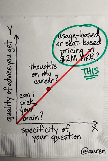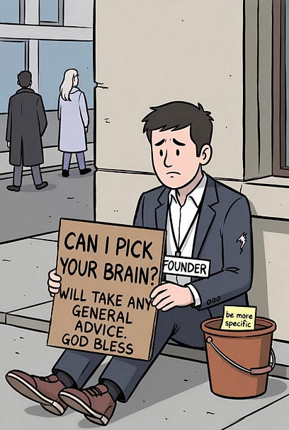 how to ask for advice (without wasting everyone's time)97.4% of people who ask for advice do it wrong.they show up with vague questions, little preparation, and somehow expect the other person to do all the thinking. then they wonder why the conversation went nowhere and the person never responded to their follow-up. don’t be that person. if you want help -- if you want real advice -- there’s a right way to get it. and most people never learn it because no one tells them. so here it is. (this is the companion piece to how to ask for an introduction and how to actually look for a job. the principles overlap -- specificity wins, vagueness kills, and nobody wants to do your thinking for you.) know what you’re actually asking forthe single biggest mistake: asking for “general” advice. “i’d love to pick your brain” is the worst sentence in the english language. it means nothing. it tells the other person nothing. and you will leave the conversation with nothing. it’s the advice equivalent of “let’s grab coffee sometime” -- which, as i wrote in the job search piece, is not a pitch. it’s a cry for help. if you show up and say “i’m just exploring options” or “i’d love your general thoughts on my career,” the advice-giver has to do all the work. they have to figure out what you need, guess at your context, and improvise something useful on the fly. most people are not good at that. even really smart people. the result is generic advice that doesn’t apply to your situation. and now you’ve wasted 30 minutes of both of your lives. come in with a specific ask. if you find yourself unable to articulate a specific question, that’s a sign you need to do more thinking BEFORE you ask for the meeting. you’re not ready. go sit with a notebook and some honesty. yes, don’t be a little cry baby: figure it out yourself first. before you ask a person, ask AIthis should be obvious by now but 80% of the questions people ask me, AI would give a better answer than i would. that sounds like false modesty. it’s not. AI has access to more information, it’s infinitely patient, and it won’t judge you for asking a dumb question. i will. (ok maybe i won’t judge you out loud. but i’m thinking it.) if your question is factual -- “what’s the standard vesting schedule for early employees” or “what are the pros and cons of a SAFE vs priced round” -- AI will crush it. don’t burn a favor on something you can get for free in 30 seconds. save your people asks for things that ONLY a person can give you. judgment calls. pattern recognition from lived experience. access to their network. opinions formed over decades of actually doing the thing. that’s what’s valuable. that’s what you can’t prompt. if you’re not sure whether AI can answer your question, try it first. if the answer is good, you just saved yourself and someone else 30 minutes. if the answer is generic or wrong, now you know this is a question worth asking a human. make sure the person can actually help youi get dozens of inbounds a week asking me for advice. i genuinely want to help everyone. but most of the time, the person wants advice on something i know almost nothing about. that’s just bad targeting. your friends WANT to help you. your network WANTS to help you. So let them help you: ask them for advice on things they can actually help with. just because a person is successful in their business does not mean they can help with all businesses. success in one domain does not transfer to all domains. if a person has never played golf, you’d never ask their advice about the best golf courses -- even if they’re an amazing skier. same thing goes for business advice. the best advice-askers are surgical about who they ask for what. they’ll ask one person about pricing, a different person about hiring, and a third person about fundraising. they don’t try to extract everything from one 20-minute conversation. they treat advice like a portfolio -- diversified across the people who are BEST positioned to answer each specific question. research the person before you reach outhas the advice-giver already written about this topic? already talked about it on a podcast? already tweeted about it 15 times? if so, you need to know that before the conversation starts. nothing is more deflating than someone asking you a question you’ve publicly answered a dozen times. it tells you they did zero homework. and the unspoken conclusion: if they didn’t care enough to spend 10 minutes researching, why should you spend 30 minutes helping them? here’s the move. before asking anyone for advice, write a very specific prompt to AI first. if i want to learn more about seed investing from Tod Sacerdoti, i’d first ask AI what he’s said about it publicly. here’s an example: gemini prompt on Tod Sacerdoti you can take it even further. before talking to someone with a public profile, ask AI to assume the personality of that person. here’s an example of asking Ken Griffin (CEO of Citadel) for advice on whether you should move to Miami: gemini prompt as Ken Griffin this is not cheating. this is called preparation. you walk into the real conversation already past the surface-level stuff, which means you can ask the DEEP questions only that person can uniquely answer. they’ll notice the difference immediately. and they’ll enjoy the conversation way more because you’re not making them repeat their greatest hits. never ask for a call when an email will dosometimes you just need a specific thing. an intro. a quick opinion. a sanity check on a number. if so, just ask via email. in my piece on how to ask for an introduction, we discuss how the best intro requests are short, clear, and email-forwardable. same principle applies here. if your advice question can be answered in 2-3 sentences, send an email. don’t make someone coordinate calendars and block 30 minutes for something that takes 30 seconds. a m
