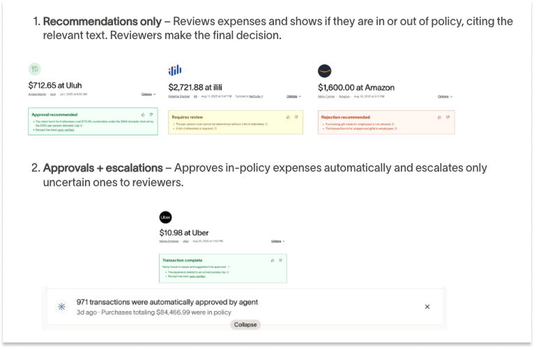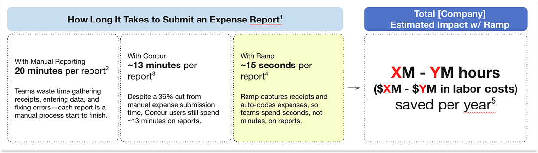 What happened was that AmEx got serious about consumer rewards and lost focus on business customers: Resy reservations, CLEAR, WalMart+, hotel credits, live events. They upped their annual membership fee from $540 to $695 and … practically no one left. The money just dropped to their bottom line. Today, they’re booking millions of tables per week. If you want to go to the US Open in style, or to Carbone, you need AmEx Platinum. They reinvented themselves as a consumer membership company, refocused on who they were, and it turned out incredibly well. Practically, for Ramp, this means they entered a seemingly crowded Corporate Card market, but what they found was a large market with no one else focused on the new luxury that is time. And if you look at the other categories that Ramp has expanded into, the same thing is true. In expense management, SAP bought Concur in 2009 and left it somewhere near the bottom of the priority stack. If you’ve used Concur, it is not focused on saving you time. In Bill Pay, you know how I feel about bill.com, and my sentiment is not, “Wow, these guys save me a lot of time.” There are countless other companies in these categories owned by PE and more focused on near-term bottom line than on saving customers time. With trillions of dollars of market cap and tens of trillions of dollars of spend on the line, Ramp keeps finding markets surprisingly bereft of competitors focused on the thing they believed matters most to businesses: time. Enduring companies don’t confuse the product with the brand. They build products in service of the brand promise. Ramp’s brand promise is that it will save businesses time. So they build products to do just that. When we spoke recently, Karim reiterated this point. It was the first thing he said: “For every product we build, and everything we do, the goal is always, ‘How can we save more time for customers?’” “Even in very early Ramp, when we built our mobile app…” he said, “think about mobile apps built at the time. They were all about trying to get MAUs and DAUs. That might be right for social media, but we had the totally opposite metric: how can people spend as little time as possible in the app? When someone clicks in the app, what are they trying to do, and how can we make that faster?” Diego Zaks, Ramp’s VP of Design, says that the company’s goal remains for its customers to NOT spend time on Ramp. They benchmark against this internally: how much time are customers spending on the platform and how can we consistently make that go down over time? The goal is that the more powerful Ramp becomes, the less time you spend on it. This is where AI comes in and is why they’re so focused on agentic work. “This is true for all of the new products we build,” Karim went on. It started with Card and Expense Management. If your expense management software was tied to your card, could see each transaction, you can turn “a complicated guessing problem into a simpler matching problem” and save hours of back and forth. As a result of that and many improvements since, Ramp can reduce the time it takes to submit an expense report by 98%. Today, Ramp’s Policy Agents can proactively review expenses based on a company’s expense policy and merchant details, and either make recommendations to human approvers or approve all of the in-policy expenses and only elevate questionable ones to humans. So far they can eliminate human review for 85-90% of them, and the product just launched two months ago. These seem like small things, but if you’ve had to submit or approve expense reports, or god forbid had to chase down employees to submit receipts, you know how much time this stuff takes - both directly and indirectly, in lost focus. This is an issue for everyone, at every level, even for very expensive people. Susan Li, Meta’s CFO, told John Collison on a recent episode of Cheeky Pint that the company is looking into ways to automate rote operational work, “and I say this as a person who is like a very expensive machine learning model for approving expenses. I'm not certain that when I approve expenses, I'm really adding a lot of deep human intelligence to this process. I'm scanning for a fairly checklistable set of things. And yet I get multiple expenses every day.” Susan Li’s reported total compensation in 2024 was $27.2 million. Assuming she works something like 70 hours per week, each hour she spends doing expenses costs the company north of $7,000. More importantly, she makes that money because she’s one of the best in the world at doing the non-expense-report-approval parts of her job. Every hour she spends doing an expense report is an hour that she is not spending on more strategic work, on decisions that could move the $2 trillion company’s market cap by tens of billions of dollars. Then there is the strife, which we have talked about since the beginning of Ramp, caused by the finance team needing to chase down employees to submit their expenses. This is so prevalent that Ramp focused on receipt chasing in its first non-Super Bowl national TV commercial: And as an Eagles fan, Lord knows I don’t want to pull Saquon Barkley off the field to do expense reports. These commercials are resonating for the simple reason that Eric and Karim were right: people care a lot more about saving time than other card and expense management companies appreciated. It is telling that Bryan Johnson, the man behind the Don’t Die movement, runs his company Blueprint on Ramp. Even the man who plans to live forever doesn’t want to waste time filing receipts. But card and expense management weren’t the only timesucks in the finance org, so next, Ramp added Bill Pay, then Procurement, then Travel, then Treasury. Ramp’s mid-market and enterprise software solution, Plus, adds more power and automation to each of these products, through traditional software features that enterprises need, and increasi