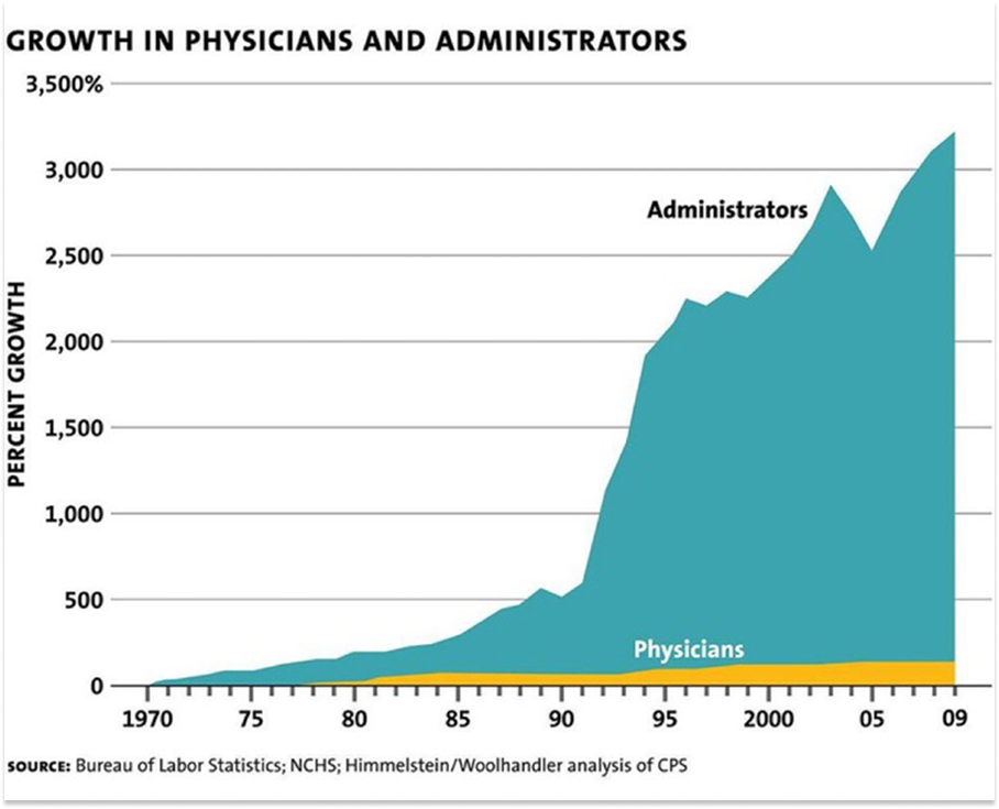 And here he was negotiating a small newsletter sponsorship deal. When I asked Calvin what he was doing in marketing, he said that good marketing looks a lot like product building, structure-wise. “It has the same tripartite structure: Performance Marketing is Engineering, Brand Marketing is Design, and Product Marketing is… Product.” When you put really great engineers in marketing, he continued, there’s a lot they can do. In Ramp’s case, he said, “We have implemented AI everywhere we can: videos and good looking static content, without a drop in quality. We’ve really optimized targeting across channels. We run experiments day in and day out, with more rigor on the experimental side.” When I asked Karim a similar question - why put engineers on marketing? - he cited “pragmatic problem solving.” “One thing that’s really different now (with AI) is that the value of skill and subject matter expertise is now relatively lower than the value of will. It’s a lot easier to learn to do something now. If you really like an ad, you can write your new ad in the same style. Really, in marketing, we’re now a lot more focused on: you have an idea, you want to bring it to life, how do you do that as fast as possible? On the creative side, you can learn a lot from history if you’re more focused on results than on winning awards.” One tangible outcome of this pragmatic approach is that Ramp’s marketing team is now much more focused on marketing to companies that don’t look like Ramp, the millions of non-venture-backed-fast-growing-tech-companies that drive a huge portion of the economy. This is something that Amin at Founders Fund noted in our conversation. “People in Silicon Valley are pretty obsessed with selling to other tech companies,” he said. “Ramp zagged, and said, ‘Let’s sell to people who don’t traditionally get this kind of love.’ Energy, education, home services, sports - areas that traditional Silicon Valley go-to-market (GTM) says, ‘Don’t focus on these areas.’” And when Ramp goes in, Amin said, they go all-in. “Ramp has quintessential adaptability - adapt or die - where they see opportunity present itself and focus their bazooka of talent on seizing it.” This is how, for example, Ramp made a Super Bowl ad in just seven days: Targeting non-Silicon Valley companies means going all-in on non-Silicon Valley tactics, too. Calvin calls this a “counterpositioning philosophy. If everyone is shifting their marketing to AI, think about the things that are going to stand out, the things that can’t be done with AI.” Of course, Ramp’s engineering-led marketing team uses AI too, probably more heavily than most marketing teams. “Both extremes are good,” Calvin said. “Go heavy into AI, or into the things that AI will never replace.” Targeting the non-tech market early is a way of fighting time, too. It’s an effort to get ahead of the fact that early adopters eventually dry up, that at some point, you need to cross the chasm. Ramp is leaping over it. With success in those harder-to-reach but larger markets, the compounding will continue more smoothly than it otherwise would. All of this is true. Fighting time internally means that Ramp can continue to move fast long past the time when most companies begin to slow down. Fighting time externally - by understanding that even the most successful startups tend to briefly sputter out at $10 billion in revenue, once they’ve run out of the usual targets - means that Ramp can continue compounding far longer than most companies do. But I think there’s something more going on here: Ramp actually just cares about saving time and money, about eliminating the bloat that weighs down companies, and weighs the economy down with them. A few minutes after I got off my call with Karim the other day, he texted me a link to this tweet. This is the kind of shit that drives him nuts. On our call, he mentioned a different but related chart, this one that’s familiar to a lot of people in tech, a symbol for the idea that anything on which tech is allowed to work its magic gets cheaper over time, while every industry that lets bureaucracy win gets more and more expensive. The chart he texted me afterwards was the “why.” “Education and healthcare outcomes haven’t gotten better in the past twenty years. What are we spending on?” he asked. And answered: “Very little money is going to educators and doctors, but a lot is going to administrative bullshit.” This is what time does, left to its own devices. It makes organizations grow. And as they grow, their coordination costs grow exponentially, and suddenly, the number of administrators in the healthcare system has grown 30x more than the number of physicians. More people to do more work created by having more people, ad infinitum. It is clearly unsustainable. “This is really where we’re applying a lot of our expertise and product building,” Karim said. “How do we get 80-90% of the bullshit work to go down so that organizations can do the thing that they exist to do?” Ramp, then, is a laboratory for the change that it wants to prosecute across the economy, from Silicon Valley to Dallas, Texas, in all of the big cities and small towns where bloat drags us down. “I don’t think Ramp is going to shrink as a company,” he said. “We will just be able to do a lot more, faster. It won’t take another 140 years to build AmEx. We can do it faster, with fewer people, doing more than AmEx is able to do.” Similarly, applying tools like Ramp, he believes, “won’t make organizations not want to grow; but it will make the productivity of each additional person a lot higher.” If Ramp can keep fighting time within Ramp and winning, the plan is to ship products at high velocity to help all of the other companies, and the whole economy, fight time and win, too. A Matter of TimeFinancial success compounds. We have seen that throughout thi
