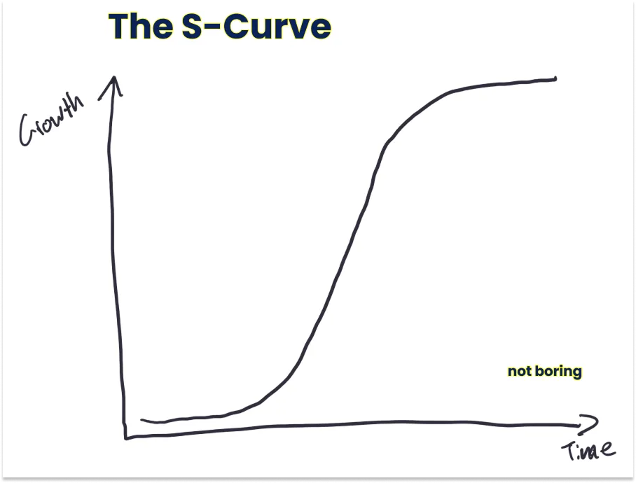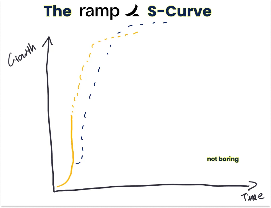Talking to Calvin and starting to write this section, I realized that one of the reasons I’m so drawn to Ramp, and one of the reasons I keep writing about it, is that it is the perfect real-time case study of the argument I made in In Defense of Strategy. I wrote In Defense of Strategy in July 2023, when AI companies were starting to grow really fast out of the gate, and when a sentiment started to grow alongside them: that strategy was for wimps, and that speed of execution was the only thing that mattered. I disagreed, arguing that “companies that are the best at execution are precisely the ones for which strategy is most important. They’re the only ones that have a shot.” “The better you are at execution,” I wrote, “the faster you can run in any direction. A good strategy helps you run fast in the right direction.” Plenty of companies have executed their way into a good strategy - they got a bunch of smart people in a room, tried a lot of things, listened to customers, learned, and iterated towards the right strategy, against which they then executed. That can work, although executing without a strategy means that you are forced to make a trade-off: either you can grow fast and then realize what you’ve built is not defensible, obliterating the value of your startup, or you can bounce around more slowly until you get to something that can grow fast, defensibly. But you can’t do what Ramp has done – grow both fast and durably, from Day 1 – without both forming a clear strategy and executing against it at high velocity. In that same Strategy essay, I tried to show why strategy - a diagnosis (there is an opening for a financial software company that helps customers save time and money), a guiding policy (“For every product we build, and everything we do, the goal is always, ‘How can we save more time for customers?’”), and coherent actions (all of the specific things Ramp does to save customers time and money) - means bigger, more durable companies, faster. Startups have an “uncertainty window” - a period during which what they’re doing is uncertain enough that others won’t copy - which can be extended by what Hamilton Helmer calls counter-positioning, “the practice of developing your business model such that incumbents have conflicting incentives preventing them to compete effectively.” For Ramp, that was saving time and money instead of offering points and rewards. During this uncertainty window, they can either use a limited set of coherent actions to aimlessly execute – the “bad version of move fast and break things where you just spasm” - or use them strategically, in one direction, such that they compound: “A good diagnosis and guiding policy channels and coordinates those limited actions so that they can compound on each other.” Execution and velocity are important. By moving fast, Ramp earned more actions during its uncertainty window, and earns more actions in any given time period now that it’s moved outside of the uncertainty window. But it is the fact that these actions are coherent, guided by correctness, that lets them compound into a business that gets more durable with time. It is unsurprising that Ramp, a company that counts the days since its founding (today is Day 2,367), understands this better than anyone. Which is an easy claim to make, but I understand if you won’t simply believe me without the numbers. The best way to think about Ramp’s business is as a series of S-Curves, each of which compounds on the others and, because Ramp has focused on releasing core, non-slop products, each of which enhances the others. As I wrote in Ramping Up, “A typical S-Curve describes the idea that a product’s growth normally starts slow, accelerates for a period of time, and inevitably slows down at maturity once it’s saturated the market. It looks something like this.” Card is Ramp’s first S-Curve, and it is still in the growth phase. By picking the competitive but massive corporate card market as its first market, Ramp picked a market in which it could grow for a very long time. As of July, Card had over 45,000 active customers and is growing through both new customers and through increased spend among existing customers. It is an impressive and compounding business in its own right. But in that same March 2022 Deep Dive, I wrote that “as Ramp’s first major non-card product, Bill Pay has the potential to build the next S-Curve for the business.” Bill Pay has realized that potential. It is the next S-Curve. Roy at ICONIQ, who has studied and invested in this space for over a decade, told me that what Ramp has been able to do with Bill Pay is very rare. “In the world of Office of the CFO tech,” he explained, “there are very few companies that have truly captured lightning in a bottle twice organically. Everyone else bought their way into the next act. But Bill Pay is very special. To have the success that product has had, you would have had to study the space for a decade to appreciate how hard it is to do this twice, organically.” Over the past year, Bill Pay’s TPV has tripled and is now higher than Card. Across Bill Pay and Card, Ramp is now at $100 billion in TPV, almost double where they were in March ($55 billion) and 10x higher than the $10 billion in TPV the company reached in January 2023. Put another way, in the over two years from January 2023 to March 2025, Ramp grew TPV by $40 billion. They increased TPV by more than that - $45 billion - in the past six months. It makes sense that Bill Pay is growing faster, and getting bigger, than Card. Recall that of the greater than $40 trillion businesses in America spend, only $2.1 trillion, well under 10%, is spent on cards. Money moves through invoices. Within Ramp specifically, Bill Pay also benefits from Ramp’s existing customer relationships. “Bill Pay and Card are both on the payables side, they’re expense related” Roy pointed out. 