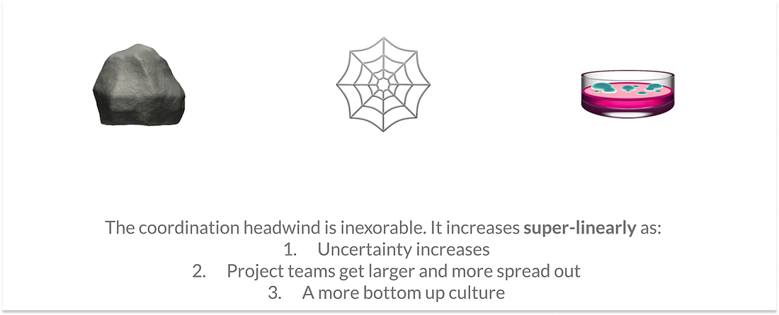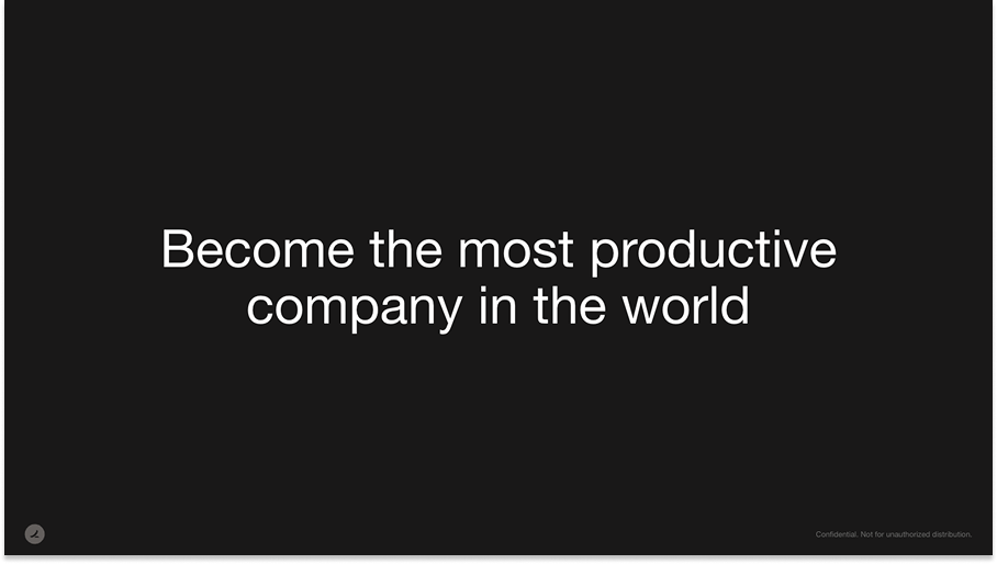 In its sixth year, Ramp is proving that it is both fast-growing and durable. That all comes back to saving time. “On the surface, it looks like Ramp is selling money,” Eric said. “But Ramp sells time. Books that close themselves, expenses that do themselves, money that flows to higher yield. Money is a great way to make money, but it’s hard to sell. It’s better to sell time. It’s bad to have your best salesperson doing expense reports. It’s cheaper to hire Ramp to do it.” “What’s core for Ramp is: do you love the product? If you do, and we get more of your spend, we get a natural take: store more funds, move more money, enable more software actions on it. We can monetize through software, or through your next business trip, take a little interchange and a commission.” If Ramp saves customers time, then over time, it wins more of their business. Counterintuitively, that means that it can grow faster, and do even more for each customer, which spins the flywheel faster. This is how you build a business that compounds over time by saving customers time. On its current trajectory, it seems that Ramp will still be around a decade from now, and that it will be a much bigger business than it is today. But Ramp itself is growing. It has over 1,200 employees now. And while time allows for compounding, it also invites sclerosis. In order for time to work with you, you have to fight to ensure it doesn’t work against you. Fighting TimeThere is a tension that comes with time, one that comes for all companies: time creates entropy. Companies get bigger. They hire more people. They have more to lose. So they respond with bureaucracy. More meetings. More stringent approval processes. Those things compound, too. And as a result, they get slower. They lose the thing that got them there in the first place. They become a Big Company. This is a well-known phenomenon that, despite the fact that excellent startups with phenomenal leaders are aware of it and actively try to fight it, still comes for the best companies. The core essay in Fred Brooks’ 1975 The Mythical Man-Month explains Brook’s Law: adding people to late software projects makes them even later, because communication overhead grows exponentially with team size. I remember Ben Nevile, Breather’s CTO, drawing these graphs with a Sharpie to demonstrate the point. My friend Alex Komoroske made a presentation titled Coordination Headwind: How Organizations Are Like Slime Mold while working as Head of Corporate Strategy at Stripe after spending thirteen years at Google. Two companies that, at their founding, would be two of the companies you would have bet would avoid the scaling sclerosis, and yet, from the inside, he said, “This happens in every successful organization over time.” It’s worth flipping through the 160 slide presentation (it’s quick). It shows that even with the most well-intentioned, talented, and team-oriented people, the math just works against a project’s success the bigger it gets. That Ramp, at 1,200 people and $1 billion in annualized revenue across multiple product lines, seems to have avoided this fate thus far, then, is remarkable and worthy of study. When you do, it actually makes a lot of sense: Ramp is entirely focused on saving companies time and money, and it applies many of the things that it does in service of that goal to Ramp itself. There is a bit of a chicken-and-egg here: is Ramp so intensely focused on making itself more efficient because its mission is to make other companies more efficient, or do both come from the same egg, Eric and Karim’s obsession with saving time and money, first for consumers, then for businesses, and for Ramp itself? Whichever way you resolve the paradox, Ramp wants to make an example of Ramp. In a recent company all-hands, Ramp reminded the team of a goal it set for itself in January: And they reminded them of what that would look like: How Ramp runs itself, then, optimistically, is a preview of what well-run companies might look like in the future, if things go right: more productive big companies behaving like small companies. So how do they do it? When I spoke to Karim, I asked him this question explicitly: “How do you avoid getting slow and bureaucratic as you get bigger?” His answer was simple: “By reducing the cost of coordination as much as possible.” Then he gave me a hypothetical example. When you think about the procurement workflow at a lot of companies, you have this chain of jobs that needs to get done to achieve an outcome. Step 1: fill out this form. Step 2: legal review. Step 3: IT review. Etc… The problem is that the IT person might be on vacation, or legal only finds out about the form two days later. Time is wasted because chaining is inherently slow. This rhymes with a point that Komoroske makes in Coordination Headwinds: each step in the chain reduces the project’s overall probability of success, because people are human. “But of course humans aren’t robots,” he wrote, pre-ChatGPT. The reason, Karim said, that you don’t just run all of these processes in parallel – legal review, IT review, etc… – is that peoples’ time is very expensive. You don’t want to run an IT review on something that ends up failing legal review. It’s a waste of time and money. But what about agents? If the marginal cost of an agent’s time is practically zero, why not just have six different agents run the process immediately and in parallel? Then, something that took weeks could take minutes. These time savings compound, too. That was a hypothetical example. Then, he gave me three real ones. Ramp’s product and engineering teams, which we talk about in every piece because of their absurd shipping velocity, have gotten even faster with agents. Today, Ramp’s engineers are more than 50% more productive than they were in 2024, as measured by commits per engineer. Coding has been AI’s breakout use case in the enterprise.