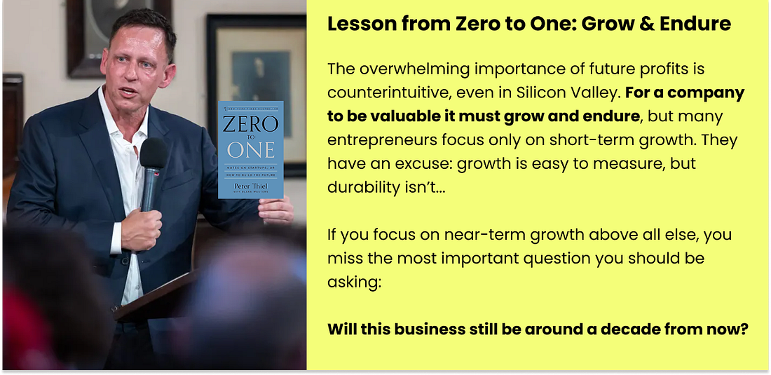 When you combine fast-growing maturing S-Curves with faster-growing new S-Curves, you can maintain high growth at scale. “If you look at our TPV YoY growth, a year ago, we were growing 2.4x,” Eric said. “This year, we are growing 2.4x. At any point in time, we’re growing just as fast off a much larger base.” As the business grows, its mix does, too, and the business gets stronger. At the end of 2023, less than 5% of Ramp’s run rate contribution profit (RR CP) was non-Card, at the end of 2024, roughly 20% was non-Card, and the company expects that roughly a third of RR CP will be non-Card at the end of this year. If there’s one thing people remember from Thiel’s Zero to One, it’s that idea that “Competition is for losers.” Ramp has shown that competition can be fine; if you’re competing on the right dimension in a large enough market, it can actually be a good thing. People are familiar with cards. That makes them an easier entry point. From there, by proving that it’s able to save time and money, Ramp can expand to new products, making the business stronger as it grows. Instead, Eric said, there are two important ideas from Zero to One, although most people focus on the first part. Since the value of a company is based on the present value of things that will happen many years in the future: