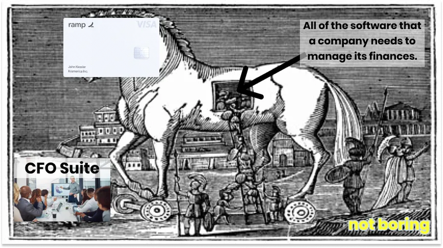 It builds products that save customers time. These products compound over time, and strengthen each other. And as an organization, Ramp is designed to fight the entropy that normally comes with time. Understanding those three flavors of time, then, is the best way I’ve found to understand Ramp. Saving TimeOne of the reasons that Ramp has been able to grow so fast for so long, as Eric will readily admit, is that it is playing in an almost bottomlessly large market. Even after all of the growth to date, “98.5% of businesses in America don’t use Ramp’s core product,” Eric is happy to point out, “and that number is misleading, because nearly 100% don’t use the additional products Ramp is building. So our real market share is closer to 0%.” There are roughly 15 million businesses in the United States, 3.5 million of which have five or more full-time employees, 2.8 million of which use cards. Ramp serves just north of 45,000 of them. Visa estimates that businesses in the US spend >$40 trillion per year, of which $2.1 trillion is spent on cards. According to Visa, there is $145 trillion of annual business spend up for grabs globally. Money itself is the largest TAM there is. Visa, relevantly, wrote, “In the $145 trillion of B2B, go spend time with like the function inside your company that is doing buyer supplier payments, and you will just, you might be surprised at how much manual work is still going on there.” But entering an existing market that large is a double-edged sword. On the one hand, it is large. There is room for growth, and for many winners. On the other hand, it is competitive. There are many competitors chasing that growth. AmEx is a $230 billion business. JPMorgan Chase, the country’s largest bank, is an $835 billion business. Other startups are fighting for that growth, too. As Ramp investor Peter Thiel famously wrote in Zero to One, “Competition is for losers.” And yet… As we’ve covered since the beginning, when Eric and Karim set out to figure out what to build next, they realized that while the corporate card market seemed saturated, there were two wide open attack vectors: