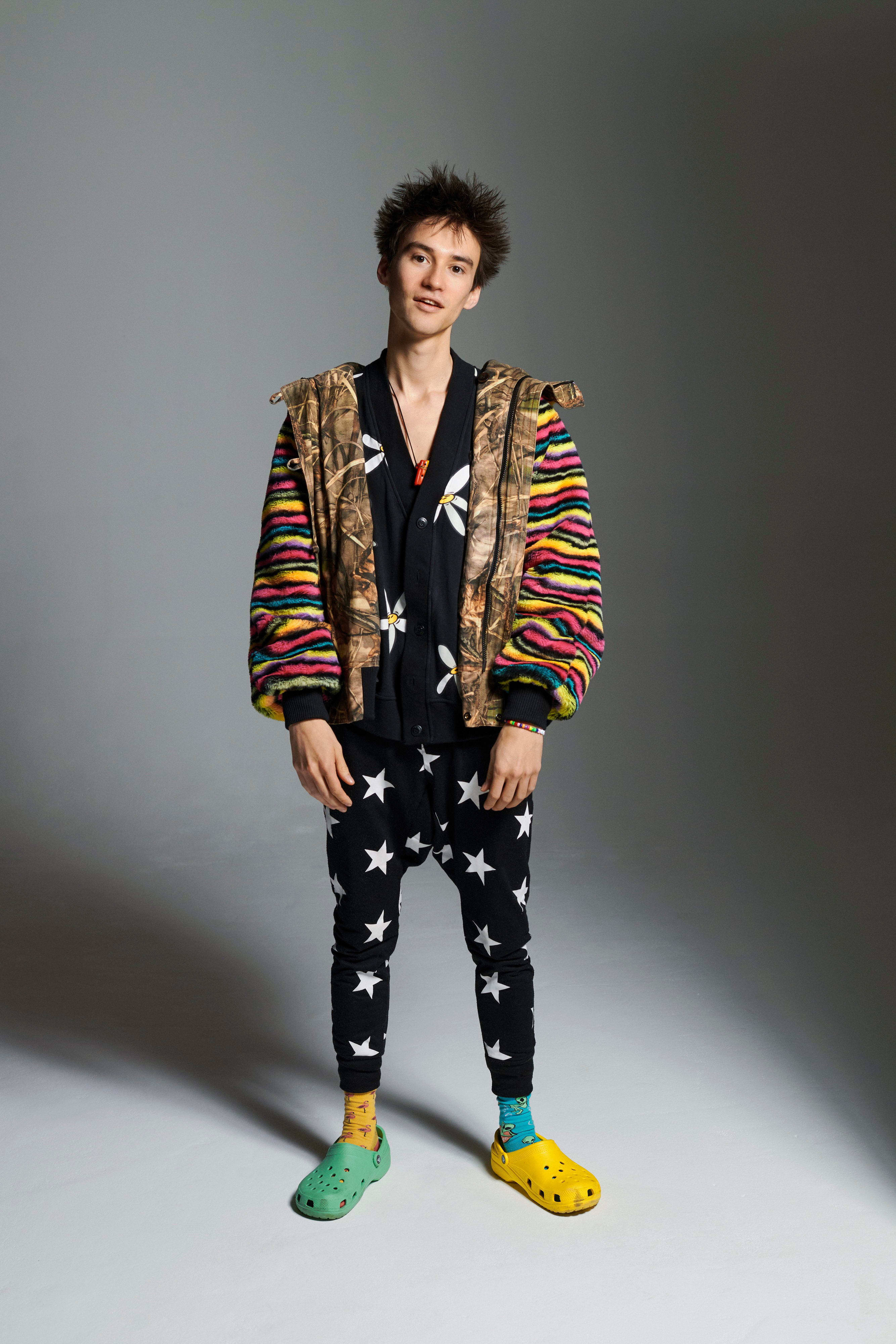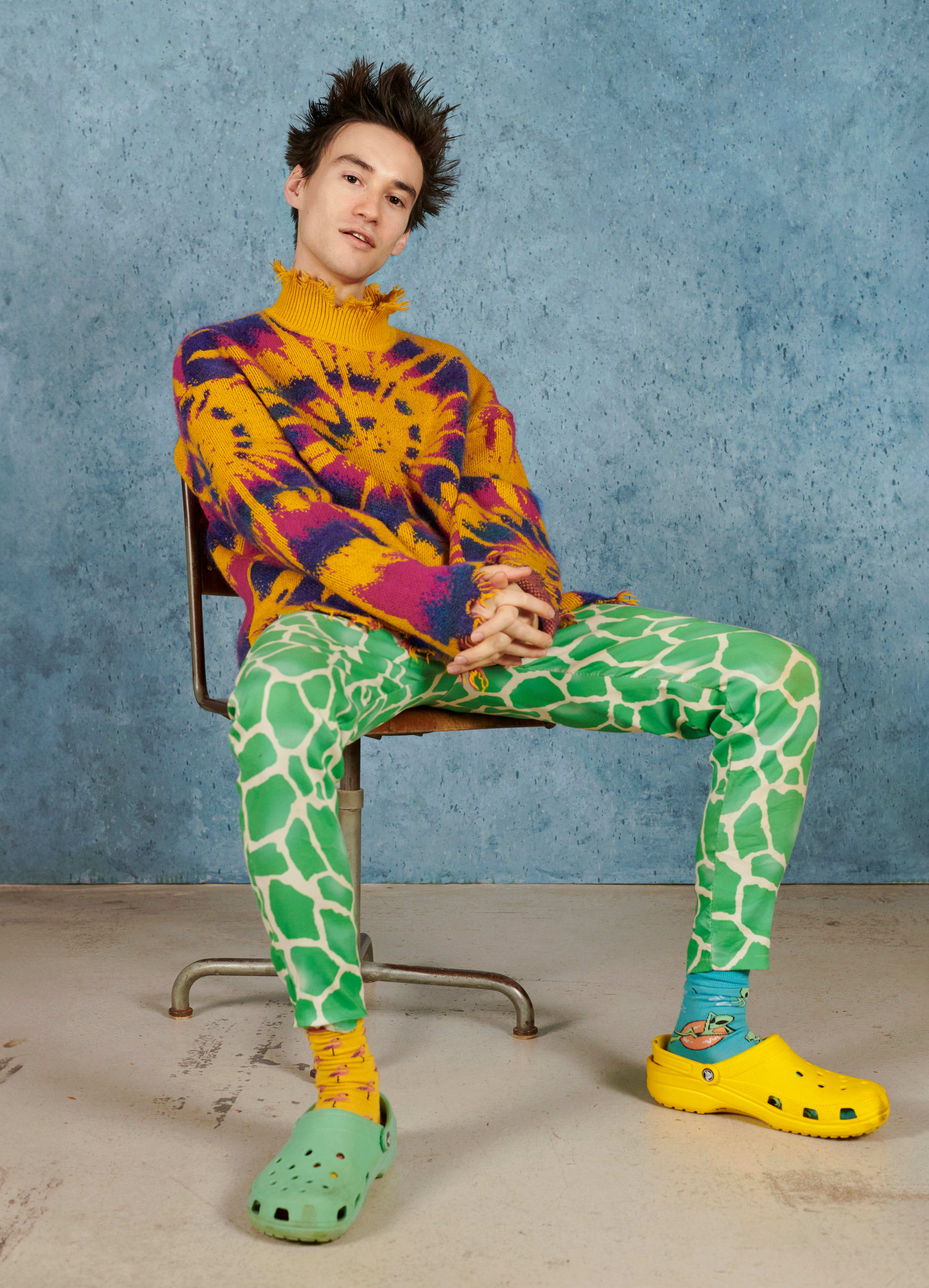 Londoner is about as far from the stereotypical, ego-fuelled A-lister as you can get. Instead he’s warm and wide-eyed, bounding around in the brightly coloured attire he’s known for. Today it’s a jacket with fur sleeves, star-emblazoned trousers, and mismatched
