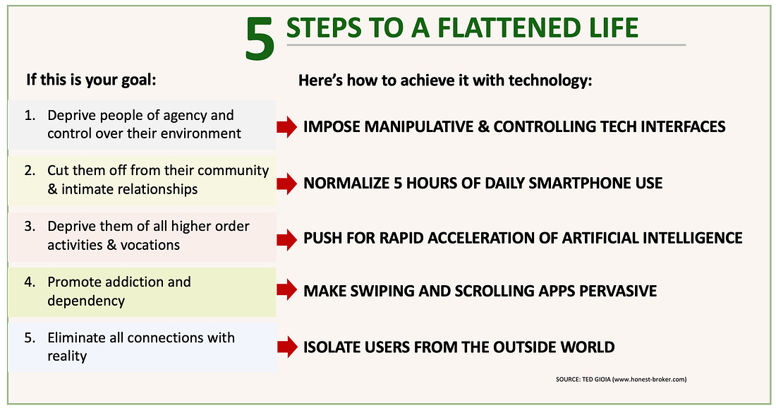 It’s been quite a year. In 2025, we published 187 articles, and generated more than 25 million views here at The Honest Broker. Along the way, we launched a new video interview series, hosted by Jared Henderson. (Our motto is: Smart conversations with smart people.) And we’ve also set up shop on YouTube, as well as the leading podcasting platforms. We continue to attract new readers. Total subscribers grew to 271,525—up more than 35% in the last twelve months. But we’re also reaching a new audience for our videos and podcasts. Some things haven’t changed here. We still operate as a community, and not a media outlet. We have open forums and engage in smart, civil dialogue in the comments—which are often the best part of the article. We appreciate your support and participation in this growing community. And if you haven’t become a premium subscriber, please consider doing so. That pays the bills, and allows us to do all the things we do. Please support our work by taking out a premium subscription (just $6 per month—or less).There were many highlights to 2025—most notably the posts linked below. Here (in reverse order) are the ten most popular articles from the last 12 months. 10. The World Was Flat. Now It’s FlattenedEvery year, I publish a “state of the culture” overview—around the same time the President gives a “State of the Union” address. This is usually one of my most widely read articles. This year I looked at the flattening of our web-driven lives. Too many of us have become ensnared by digital platforms that are becoming more authoritarian and sterile with each passing month. I shared this chart, which captures the bunker mentality now dominating the web. 9. Is the Bubble Bursting?I initially published this article behind a paywall in August, but later made it available to everybody. I made a number of predictions here, and they all seem to be coming true. 8. Substack Has Changed in the Last 30 DaysThis was the year that everybody showed up at Substack. Magazines like The New Yorker and Billboard joined the platform. Political candidates of all stripes started posting here. Consumer brands launched their own newsletters. And hundreds (or thousands) of journalists left legacy media to find a safe haven here. In this article, I took the measure of these rapid changes. And I tried to anticipate what will happen next. 7. A Major Newspaper Publishes a Summer Reading List—but the Books Don’t ExistThe single biggest threat to culture right now is AI slop, which is squeezing out human artists with bot-generated garbage. Most readers here share my disgust, but media outlets are unfazed—even after so many scandals. The starting point for this article was an embarrassing situation at the Chicago Sun-Times. The newspaper recommended books for summer reading—but the first ten books on their list didn’t exist. They were AI hallucinations. Anybody with half a brain still intact can grasp the threat this poses. I also shared a KPMG survey which asked people about 14 possible risks from AI. Respondents rated every one of these risks as moderate or high Silicon Valley is still in denial. And so are the bosses at many culture businesses. This story is ongoing, but I can already tell you that the worst is yet to come. 6. Our Shared Reality Will Self-Destruct in the Next 12 MonthsUntil recently, I could tell the difference between real video and AI video. The same was true of AI music and photos. But it’s now hard to identify the robots in our midst. This article warn how this collapse in metrics of reality will impact us. I identify six symptoms—and you can already see them impacting society. And not for the better. 5. David Foster Wallace Tried to Warn Us About These Eight ThingsI never met David Foster Wallace. But I grieved as though I lost a close friend after his suicide in 2008. He had a tremendous impact on my worldview and vocation as an author (or even as a human being). And I lament his passing more each year—because almost everything he warned about in his writings and interviews is coming true. I wish he were still around to offer his guidance. But we can make a start by paying close attention to what he said while he was around. I try to summarize it in eight key points in this popular article from September. 4. The World’s Largest Search Doesn’t Want You to Search.During the last year, Google has gradually abandoned its commitment to providing search results. Instead of offering access to many viewpoints, it prioritizes a single AI-generated response. Goodbye diversity and pluralism, hello centralized control from Palo Alto. The risks here are obvious and enormous.